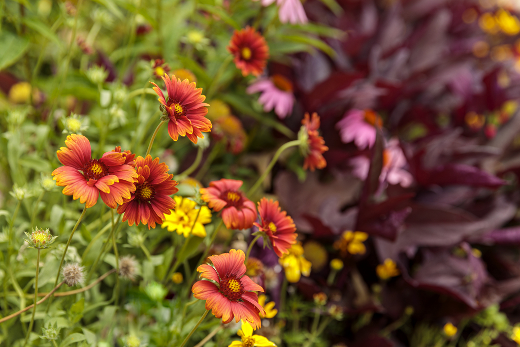Gaillardia is a hardy perennial featuring vibrant, daisy-like blooms in fiery red, orange, and yellow shades. Its cheerful, bold colours and slightly rugged appearance embody the essence of a lived-in garden, adding warmth and vibrancy to the landscape. Its informal growth habit allows it to blend seamlessly with other species, contributing to the layered, lived-in aesthetic that feels both inviting and natural.