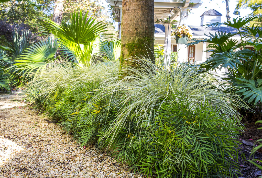 En last but not least hebben we Lomandra: de super-sterke Lomandra White Sands om precies te zijn. Oersterk, elegant, snelgroeiend, hittebestendig, droogtebestendig en geweldig mooi. Het is de allereerste bonte Lomandra en een fantastische toevoeging aan borders in de jungletuin.