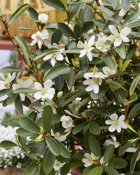 Alles met groot blad zorgt voor een mooie, jungle-achtige achtergrond. Er is een breed scala aan Magnolia-bomen, maar ze zijn lang niet allemaal geschikt voor kleinere tuinen en hebben ook niet allemaal de bladeren die bijdragen aan de jungle-sfeer. Magnolia Starburst daarentegen is klein tot middelgroot, heeft het rijke donkergroene blad om dat junglegevoel te geven en vult het aan met ongelooflijke bloemen die een universum van rood-roze sterren lijken te onthullen. Ook Vanilla Pearls heeft mooi, donkergroen blad, maar is dan weer een betere keuze voor het exotische terras.