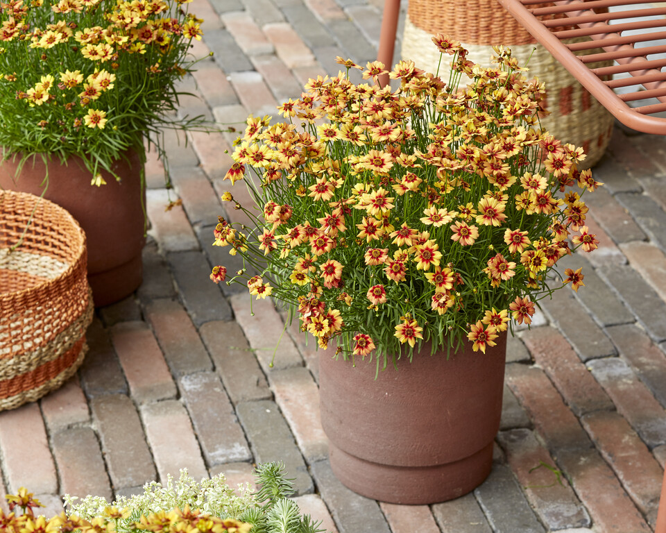 Hetzelfde kan gezegd worden van de Coreopsis Twinklebells-serie en de onlangs geïntroduceerde Coreopsis Solar-serie. Beide series bestaan ​​uit zeer kleurrijke en uitbundig bloeiende Coreopsis die flink wat kleur toevoegen aan een terracotta basis. De overvloed aan opvallende, felgekleurde bloemen bieden een mooi contrast met de terracotta potten of bieden, zoals Twinklebells Copper een mooie aanvulling op de terracotta tinten.