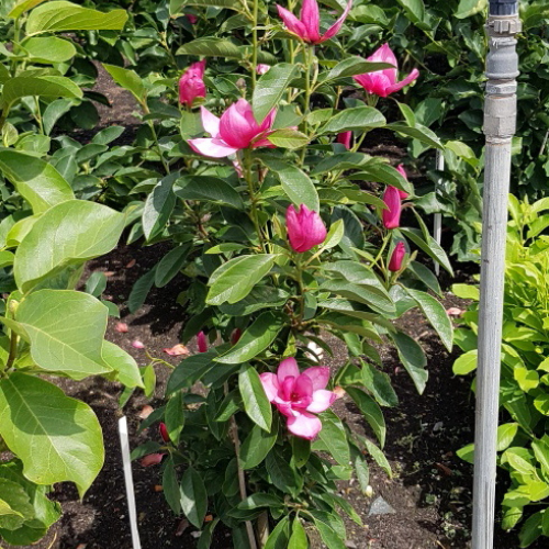 Magnolia Pink Pyramid is een smal opgaande boom die na tien jaar zo'n 4 m hoog en 1,5 m breed is. Het is hiermee een uitermate geschikte boom voor de landschapsinrichting, de kleinere tuin of zelfs voor in pot op terras of balkon. Ze heeft een smalle, opgaande groeiwijze, waardoor ze in kleinere tuinen niet al te veel ruimte in beslag zal nemen. Het blad is donkergroen en de bloemen kleuren van paars naar donkerroze. Het beste nieuws? Je hoeft niet lang te wachten tot de prachtige bloemen verschijnen. Pink Pyramid bloeit al op jonge leeftijd en bloeit in het voorjaar met een herbloei in de zomer!
