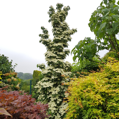 Cornus Flower Tower is, zoals de naam al aangeeft, een bloeiende toren. Flower Tower groeit rechtop en zuilvormig, wat hem perfect maakt voor kleine tuinen. Hij wordt ongeveer 4 m hoog en 1 m breed, waardoor er voldoende licht en ruimte overblijft om van de tuin te genieten. En alsof dat nog niet genoeg is, bloeit hij uitbundig in de vroege zomer en weet hij in de herfst te verrassen met zijn scharlakenrode blad.
