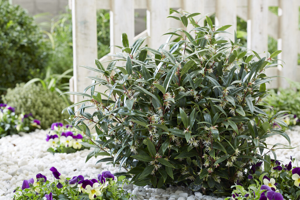 De populaire Sarcococca hookeriana Purple Gem ('PURPLERIJ1'PBR) zal ook worden tentoongesteld op de stand van Plantipp. Een elegante, bossige, heerlijk geurende Sarcococca met een goed vertakte groeiwijze, een sterk wortelgestel en diep paarsrode stelen.